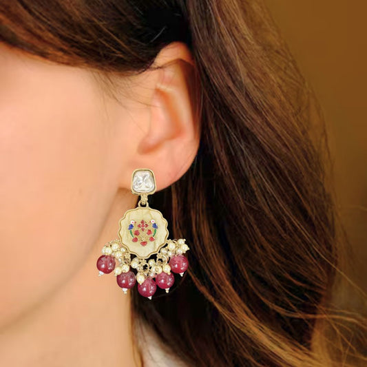 High-Quality Gold Plated Kundan Earrings with Enamel & Pink Semi-Cultured Pearls