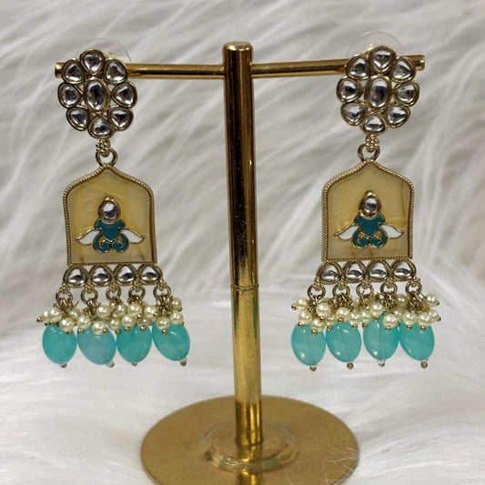 High-Quality Gold Plated Kundan Earrings with Enamel & Blue Semi-Cultured Pearls