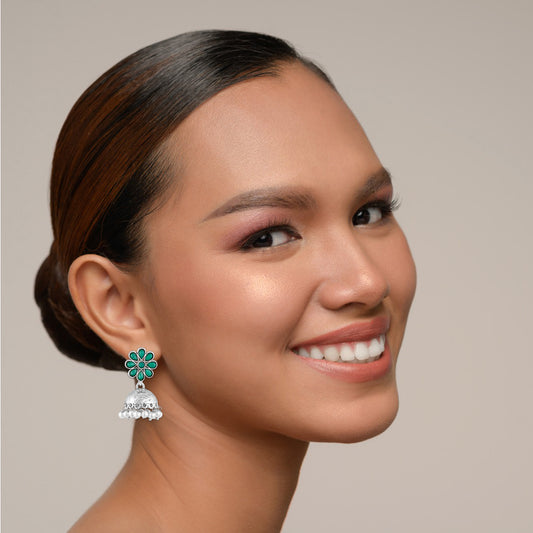 BDiva Oxidized Fusion of Tradition and Elegance Green Stone Floral Jhumka Earrings