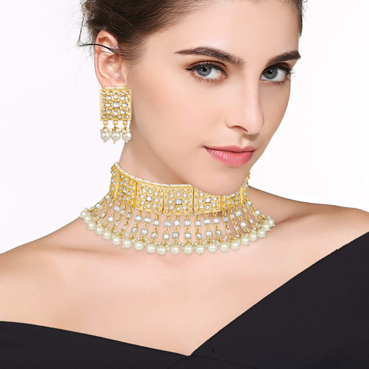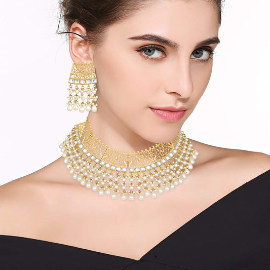 Bdiva 18K Gold Plated Kundan Semi Cultured White Pearl Choker