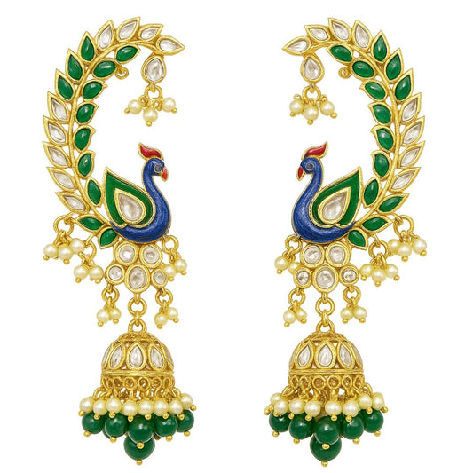 High Quality Gold Plated Heritage Peacock Jhumki Earrings with Kundan & Semi-Cultured Pearls