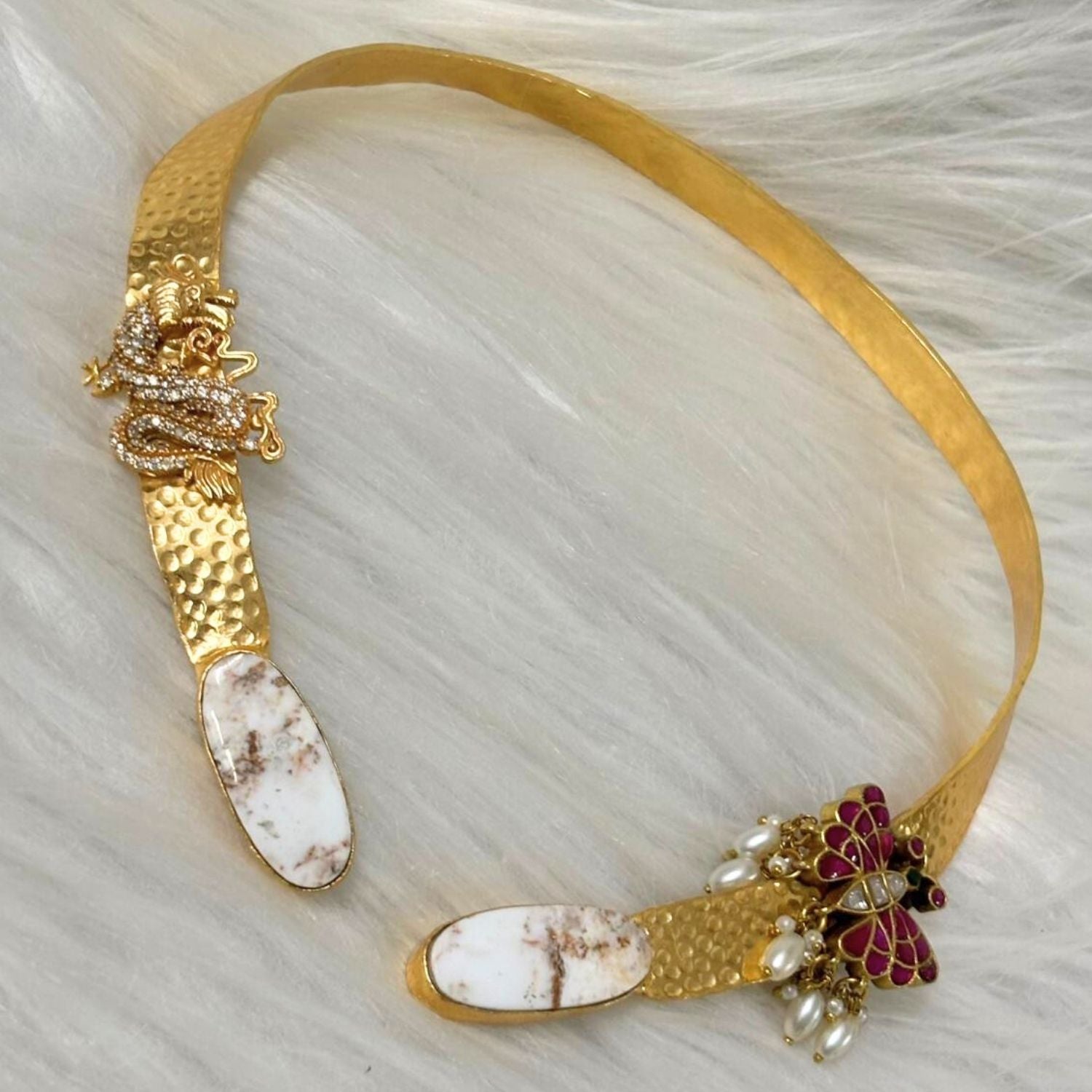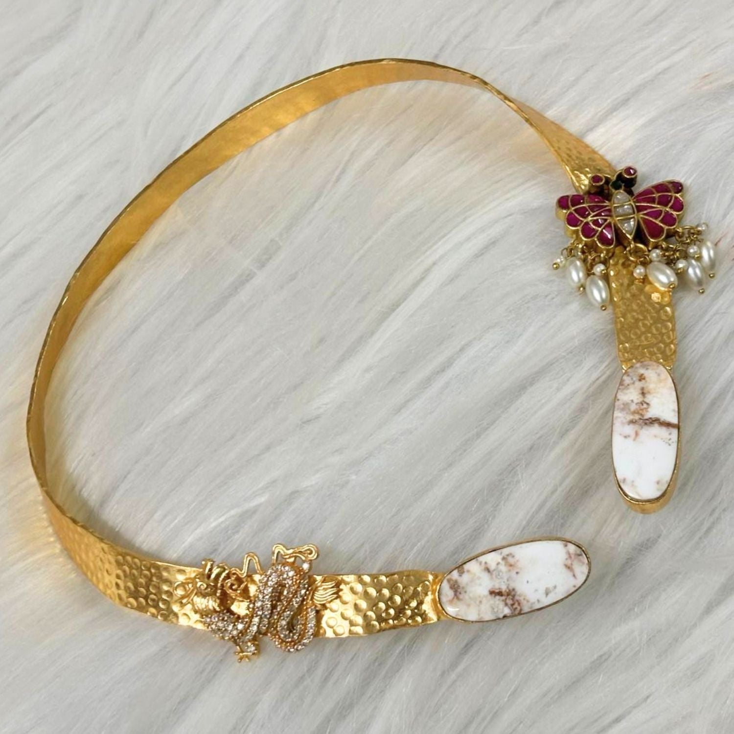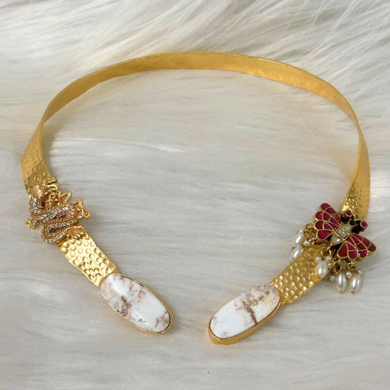 This gold-plated open collar necklace blends modern elegance with artistic craftsmanship. Designed with organically shaped semi-precious stones, each piece highlights natural textures and earthy tones, beautifully contrasted by a warm gold finish.