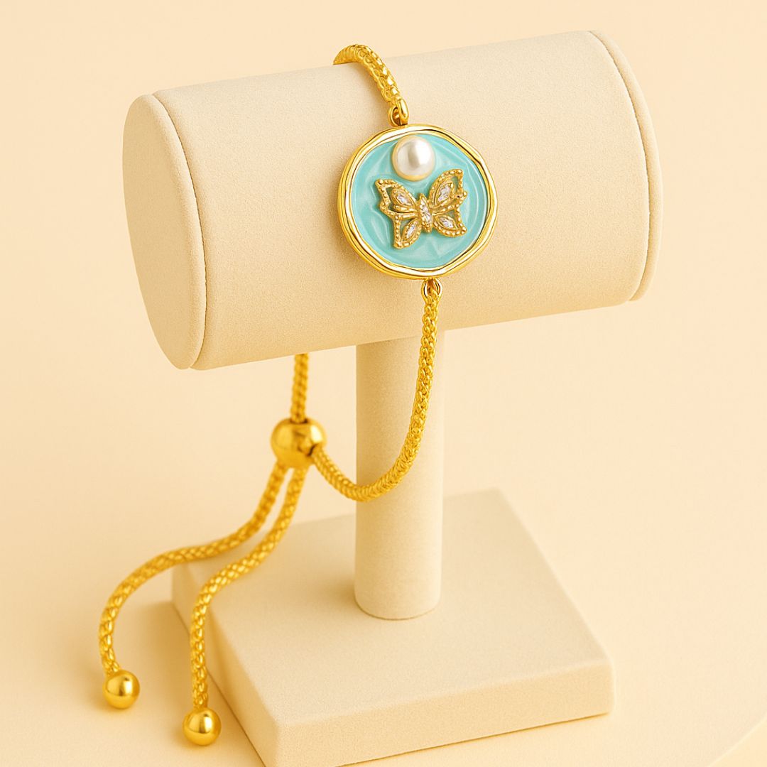 The Bdiva Butterfly Pearl Bracelet is a celebration of transformation, beauty, and quiet strength. Featuring a finely crafted butterfly motif paired with a luminous pearl, this design symbolises growth, freedom, and elegance — values close to every modern woman. Crafted with premium gold plating and finished with a drawstring adjustable closure, it offers a comfortable, customised fit for all wrist sizes. The sleek chain and minimal silhouette make it perfect for daily wear, office styling, casual outings, or thoughtful gifting.