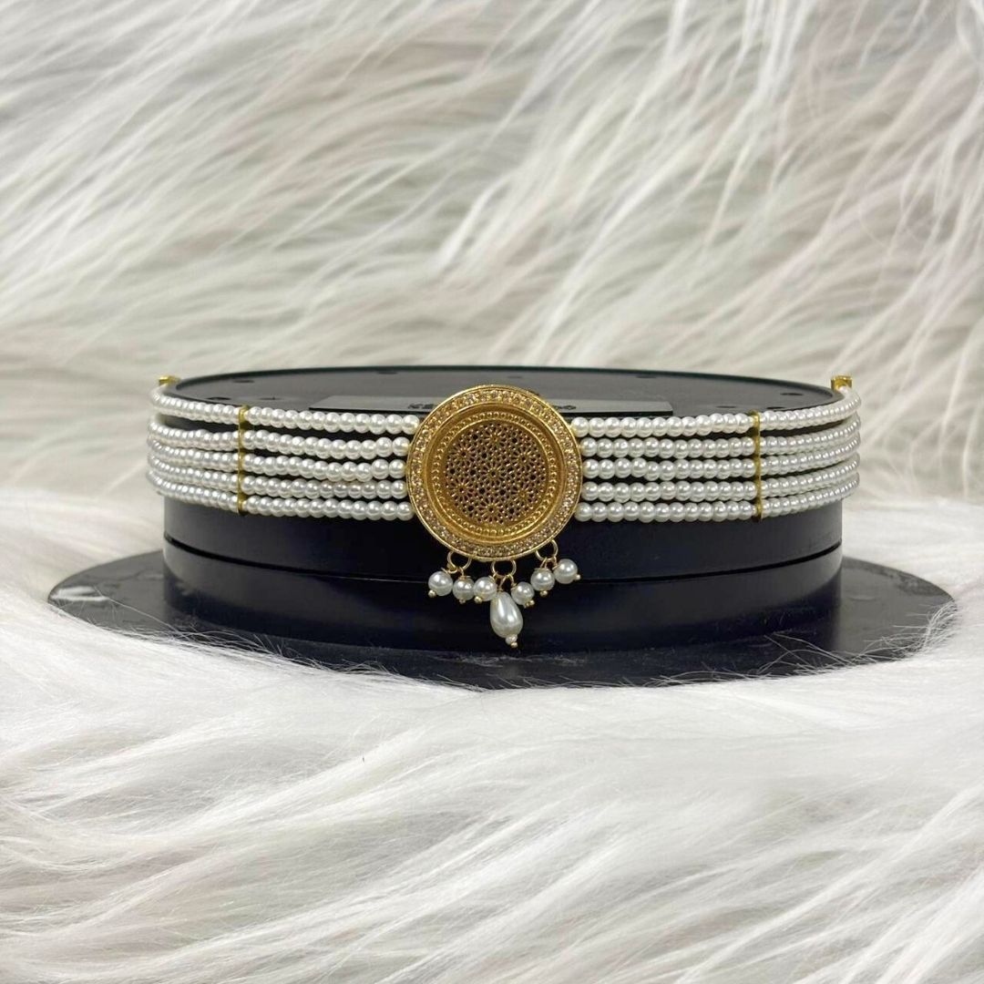 Product: Classic Semi Cultured Pearl Choker Necklace Set, a classic celebration of Indian craftsmanship and regal charm. Designed with intricately set kundan stones, delicate pearl drops, and rich gold plating, this set exudes old-world elegance with a contemporary finish.