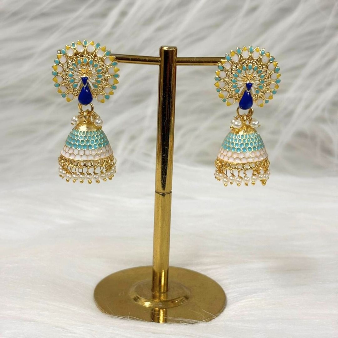 Product: BDiva’s Blush Peach Peacock Jhumka Earrings, where soft, delicate tones meet regal design to create a stunning accessory that speaks of sophistication and grace.