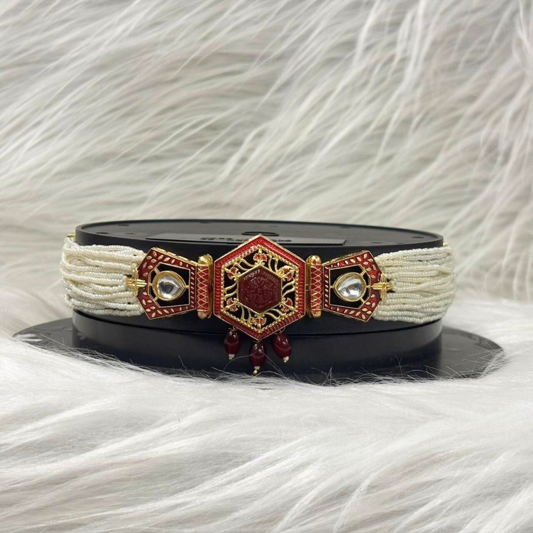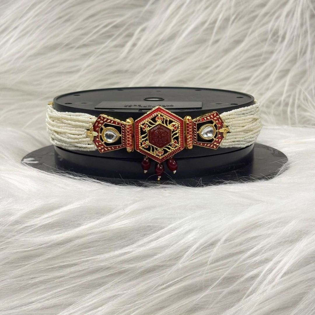 Crafted with high-quality materials, the Regal Kundan Pearl Choker Set is not just an accessory but a reflection of your strength, beauty, and unique style.