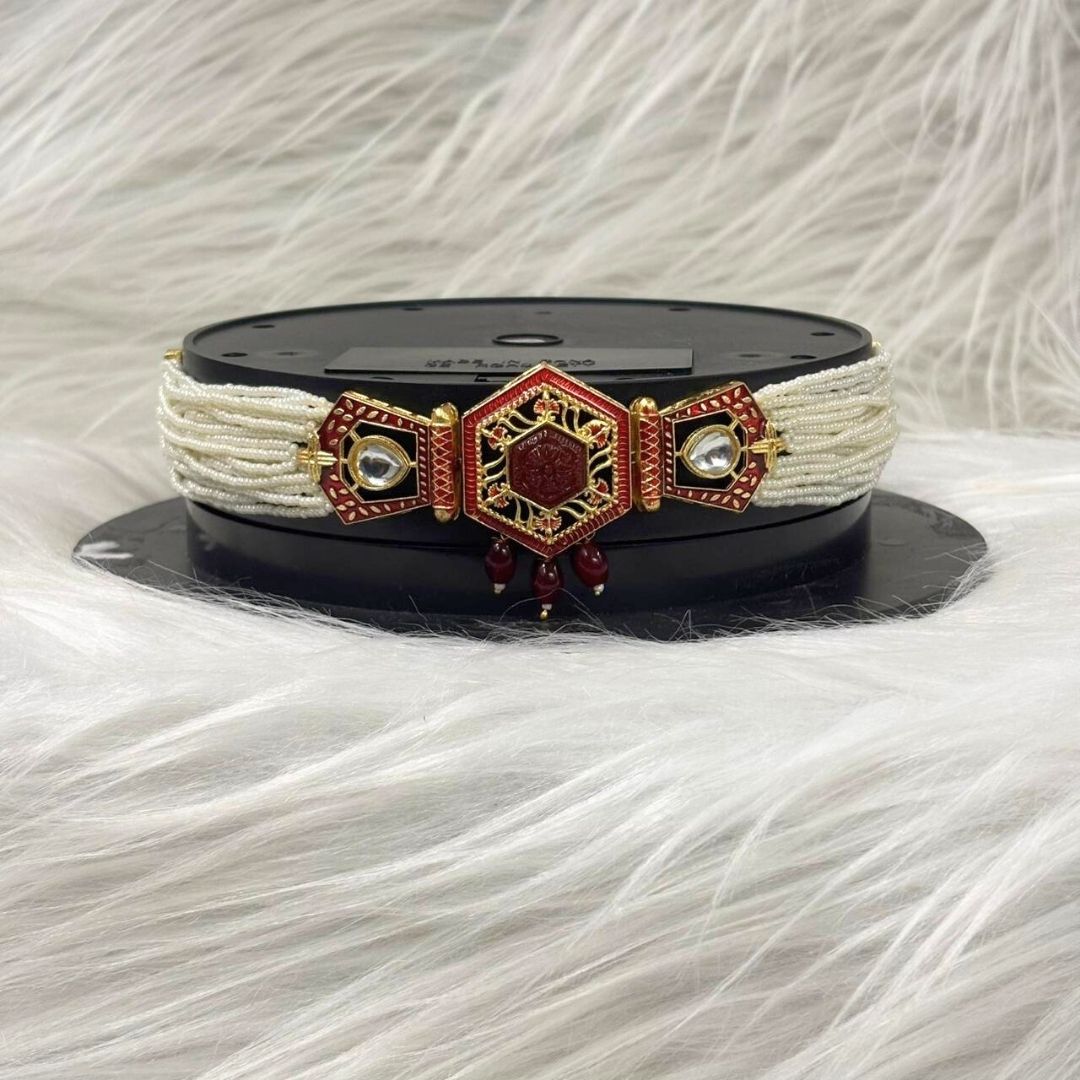 Product: Royal Kundan & Marron Pearl Choker Necklace Set, a classic celebration of Indian craftsmanship and regal charm. Designed with intricately set kundan stones, delicate pearl drops, and rich gold plating, this set exudes old-world elegance with a contemporary finish.
